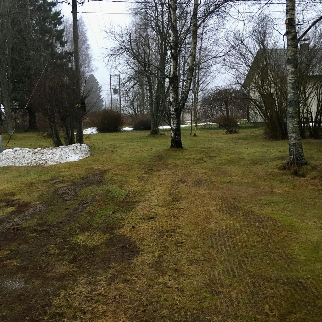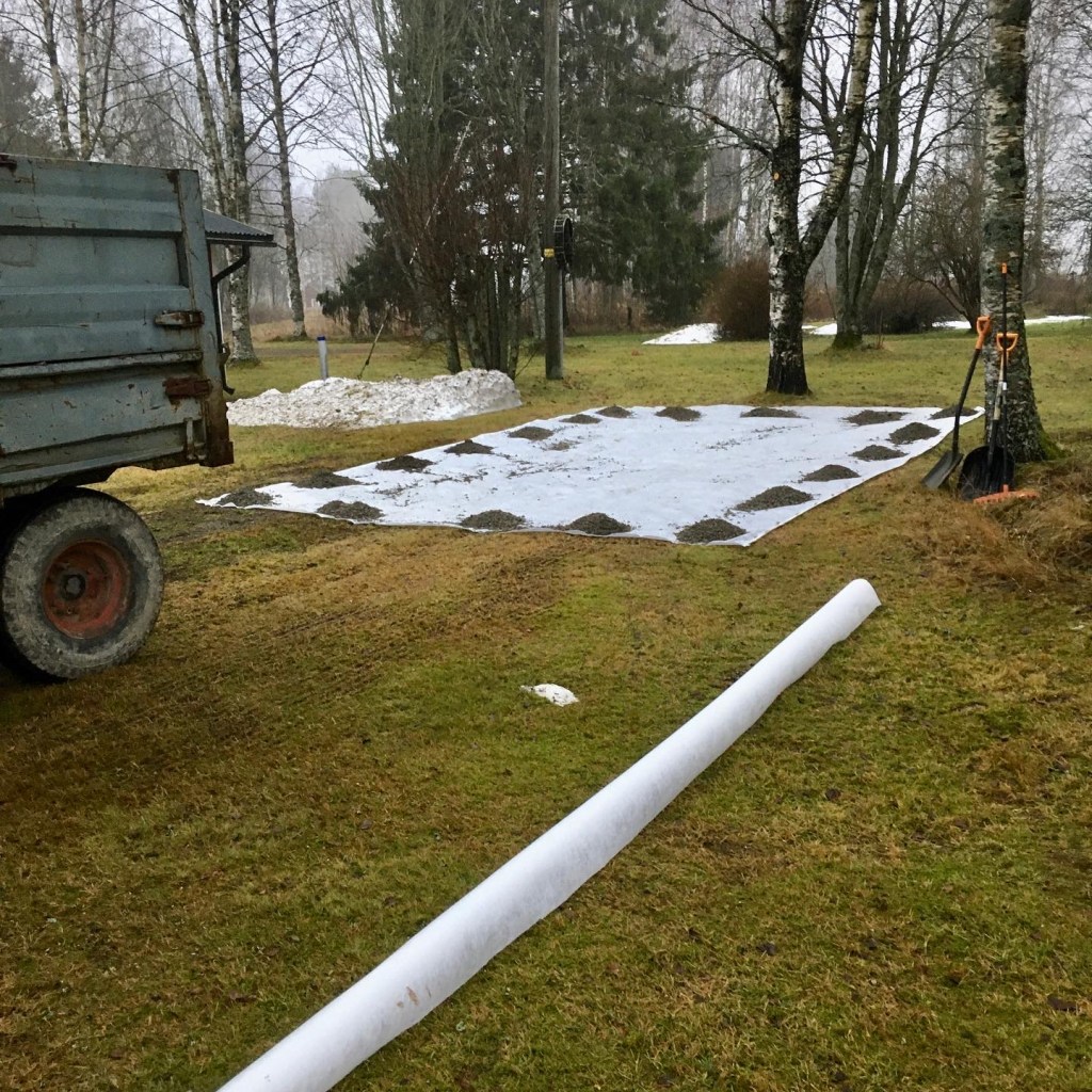 Tässä esimerkkipaikassa tiedettiin, että paikka jonne lato haluttiin pystyttää, oli pohjaltaan kovaa moreenia ja vieläpä loiva mäki, joten sade-/sulamisvedet ei olisi tässä ongelma. Pohja oli itseasiassa ennen ollut parkkipaikka, joka vain oli vuosien saatossa heinettynyt sen käytön puutteen vuoksi. Joten emme lähteneet kuorimaan heinikkoa sen kummemmin pois.