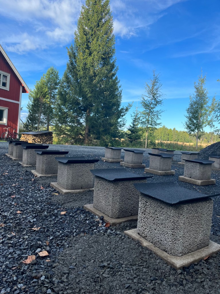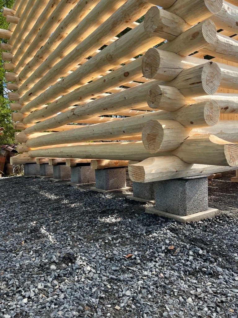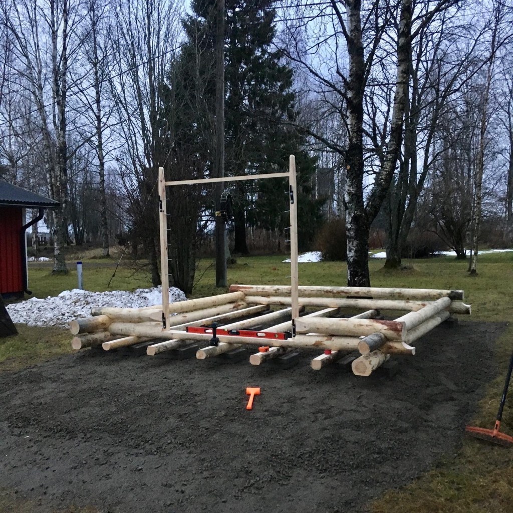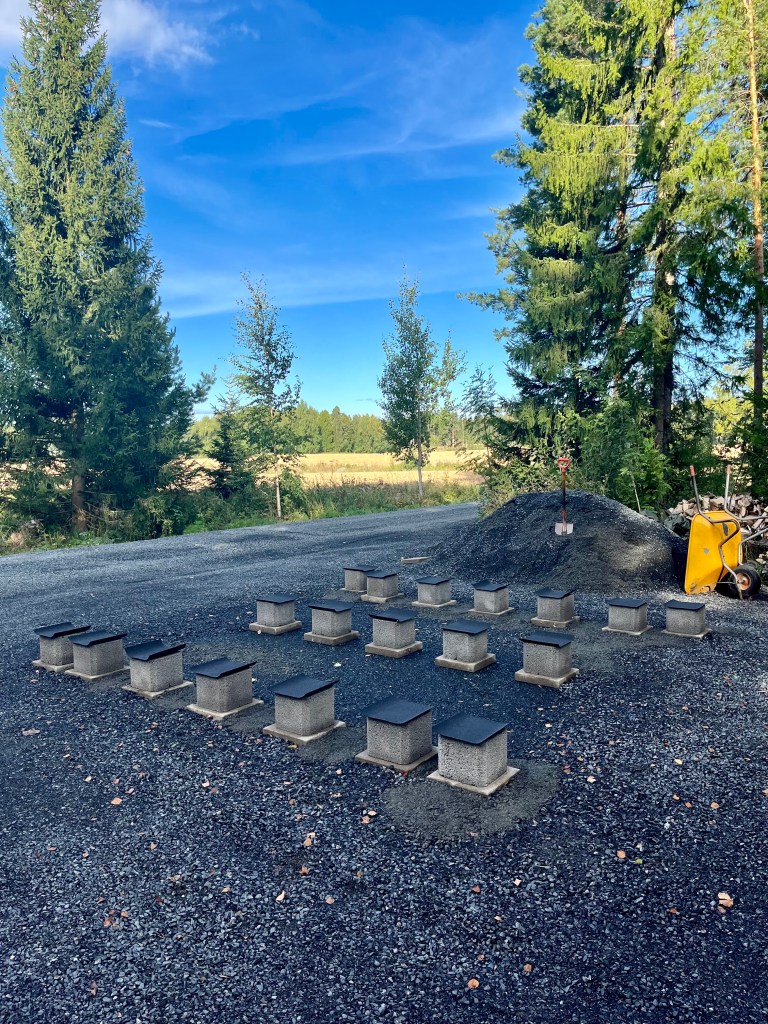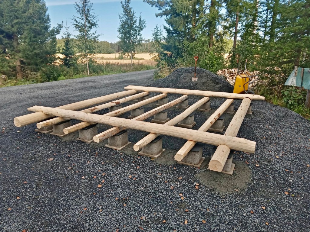 Välillä aina tulee kysymyksiä miksi näin paljon pitää laittaa laattoja ladon alle, eikö vähempikin riittäisi?! Ideana tässä on, että nurkkiin tulevat laatat (4kpl) kannattelevat ladon kehikkoa, ja keskelle tulevat laatat (15kpl) tulee lattianiskasten alle. Sitten kun lattiaa tehdään, niin siinä jätetään lattialaudat irti kehikon alimmista hirsistä n. 1cm verran, jolloin ladon lattia jää ”uivaksi”. Tässä on taas sellainen etu, että jos/kun lattia painuu vuosien saatossa halkojen painosta maahan jonkin verran, niin se ei painata ja väännätä kehikkoa mukanaan. Sillon lattia saa ”elää omaa elämää” ja kehikko pysyy aina suorassa ja ryhdissä.