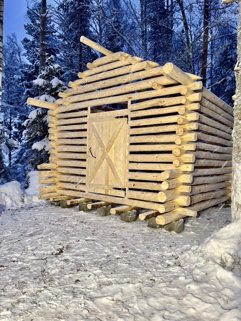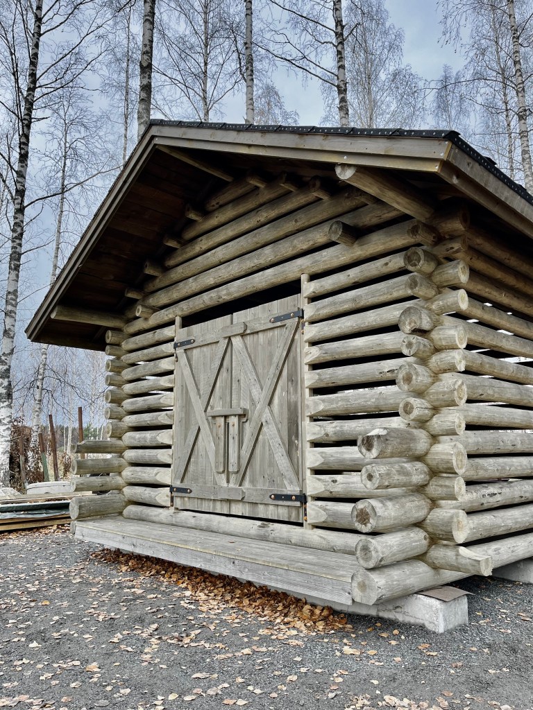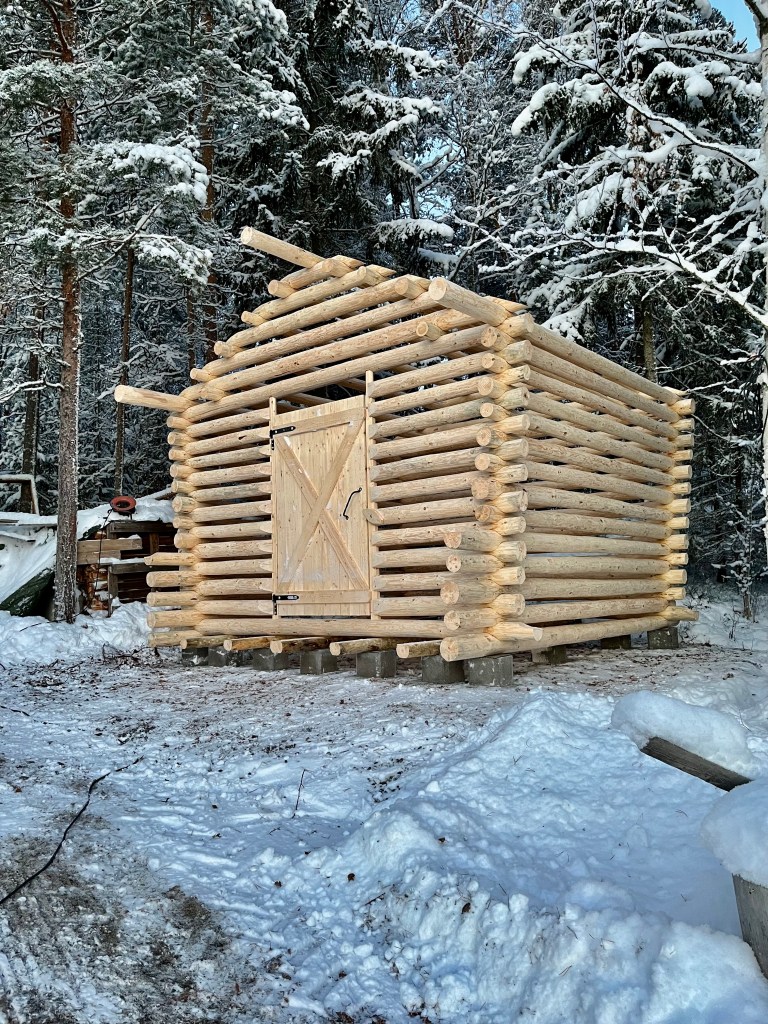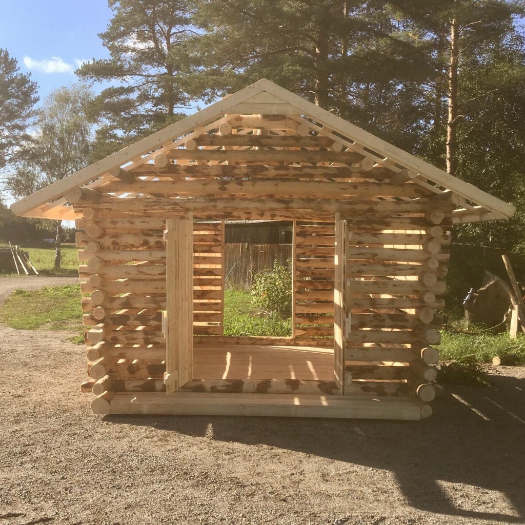 Perustoimitukseen kuuluvat kehikon hirret, 5kpl lattianiskasia ja oven karapuut.