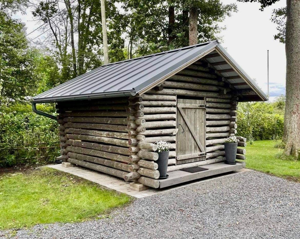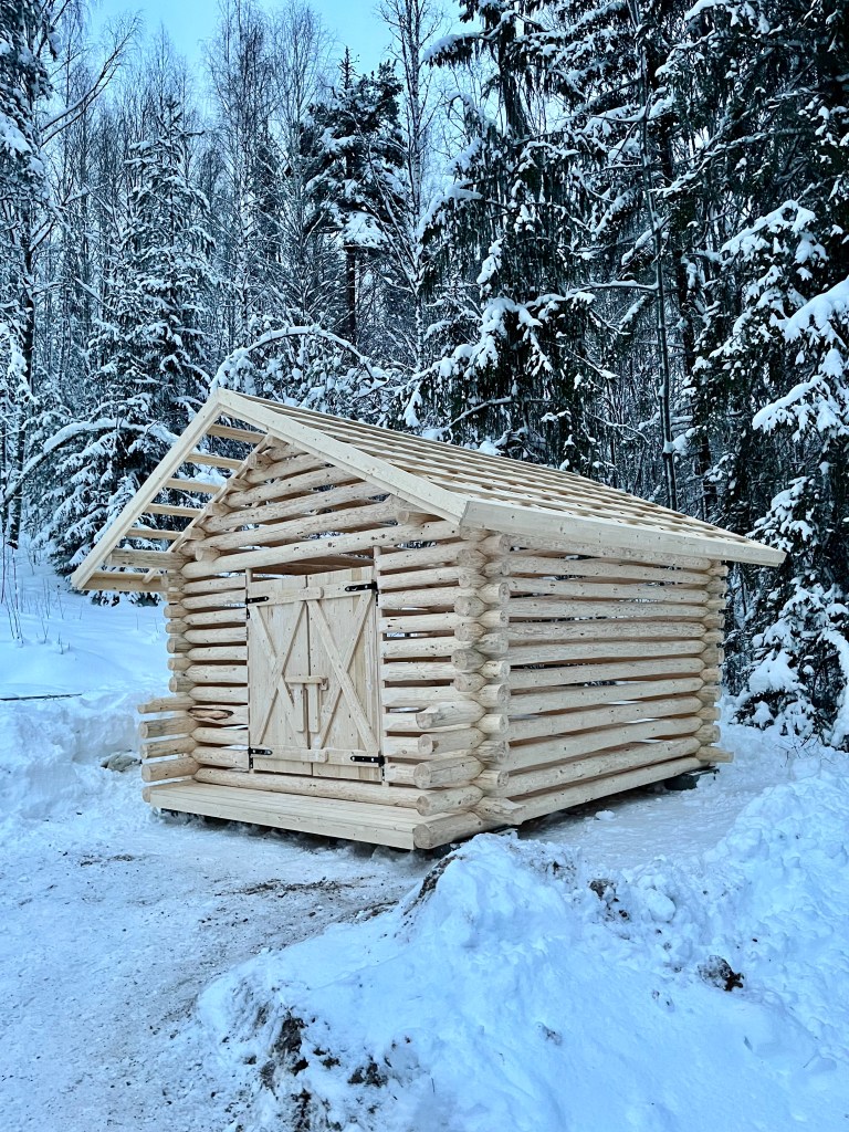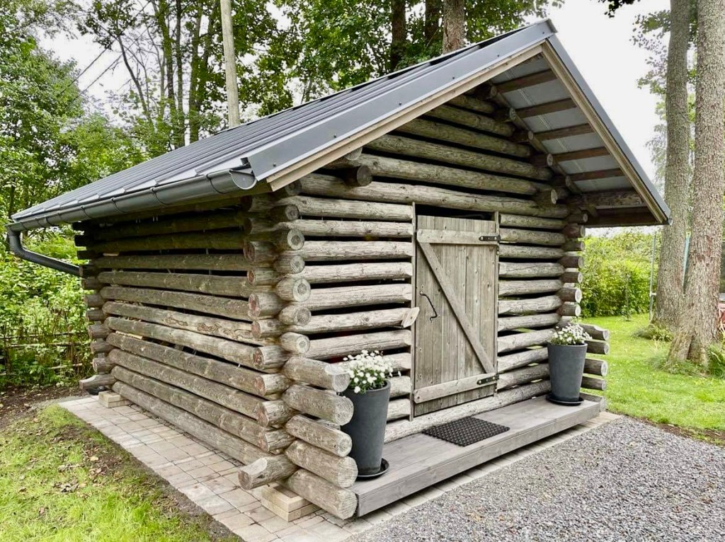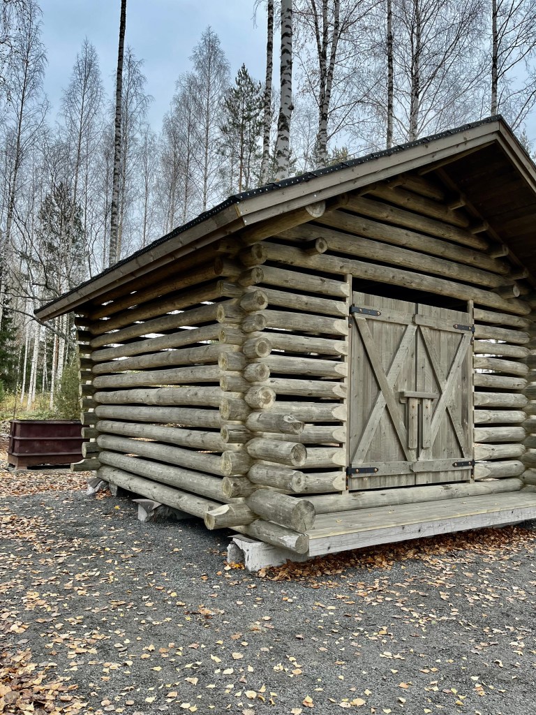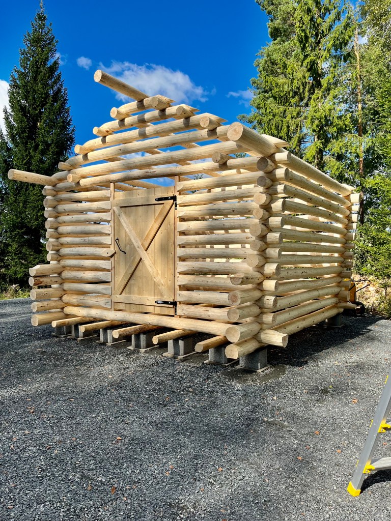 Perustoimitukseen kuuluvat kehikon hirret, 5kpl lattianiskasia ja oven karapuut.