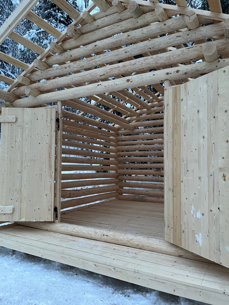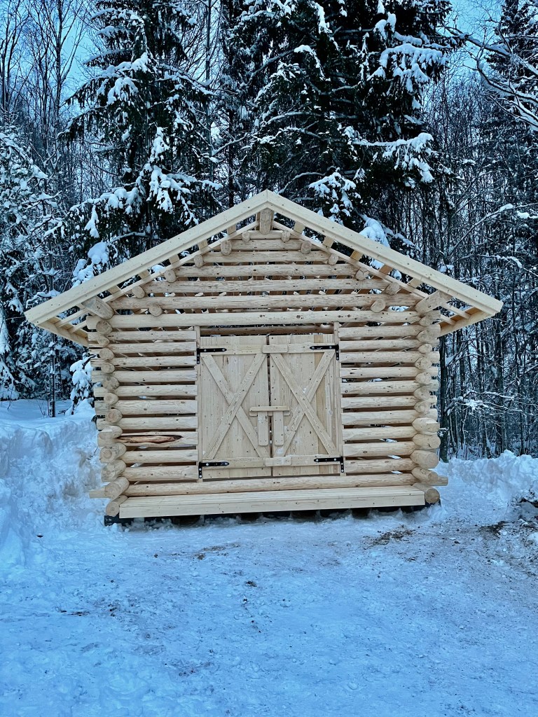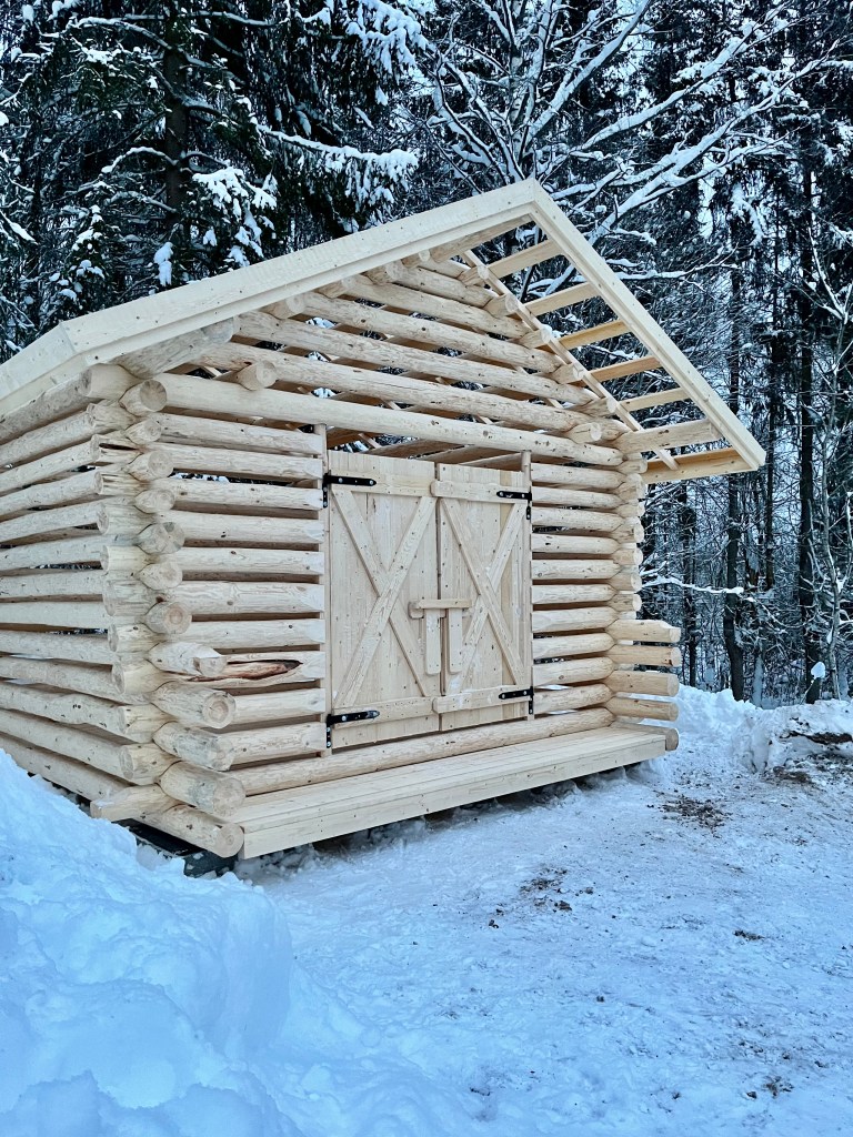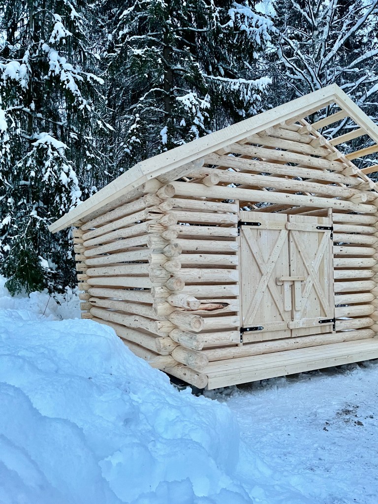 Asiakkaan toiveista muokattiin vakio ladosta läpijuostava malli. Tämä oli pohjaltaan ihan vakio kokoinen lato, mutta eteen tehtiin 150cm leveät pariovet helpottamaan ladon täyttämistä ja taakse normi ovi 105cm leveänä mistä sitten haetaan saunaan puut.